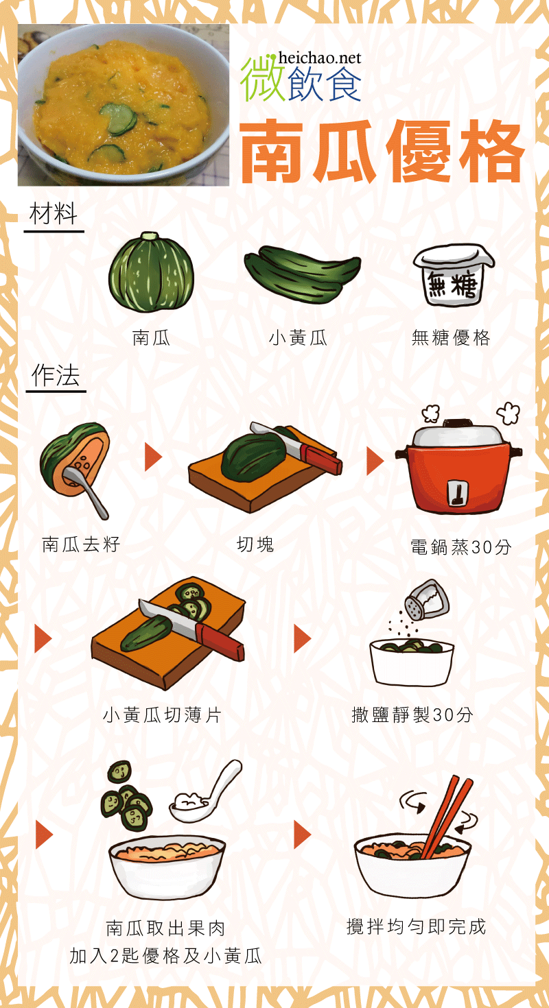 - 南瓜稍微放涼,取出果肉,加入2大匙無糖優格及小黃瓜