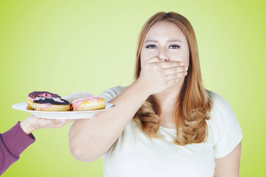 67348799 - portrait of young woman closed her mouth while refuses a plate of donuts