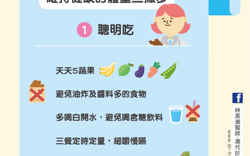 除此之外,食物種類的選擇也相當重要,飲食營養要均衡攝取,天天五蔬果,油炸及醬料多的食物盡量避免,多選擇原型食物,少吃加工食品,多喝白開水避免喝含糖飲料,三餐定時定量,細嚼慢嚥,不吃宵夜。