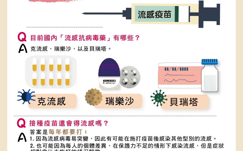 目前國內有的流感抗病毒藥有:克流感(Tamiflu/Oseltamivir)、瑞樂沙(Relenza/Zanamivir)、以及貝瑞塔(Rapiacta/Peramivir)。