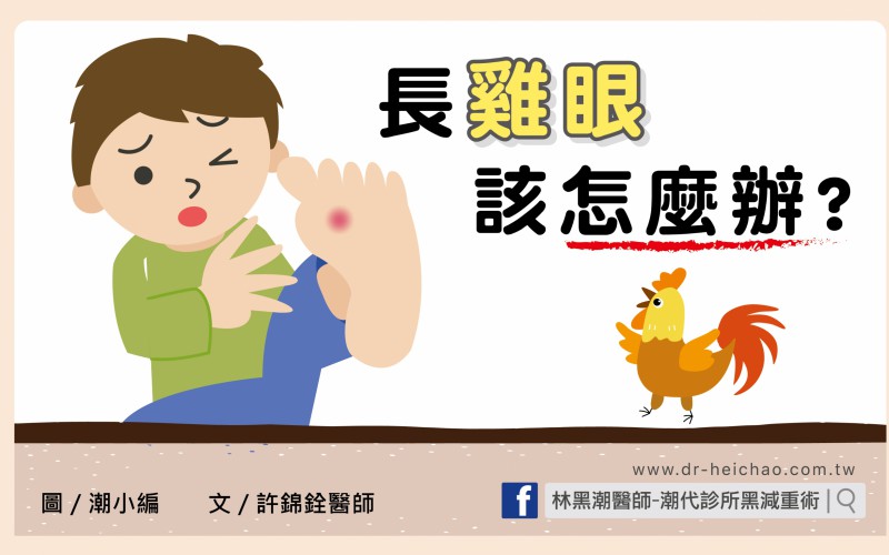 雞眼是皮膚受到壓迫與摩擦後,為了自我保護而不斷向下變厚、變硬的一種角化組織,看起來透明,中心會有呈黃白色突起的硬顆粒。